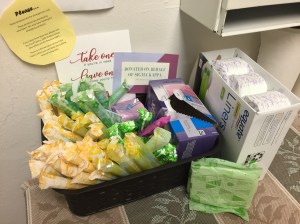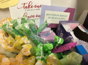 Sigma Kappa, a Northwest Missouri State University sorority, “adopted” the We Gotchya baskets this month, filling them to the brim with tampons pads and liners.