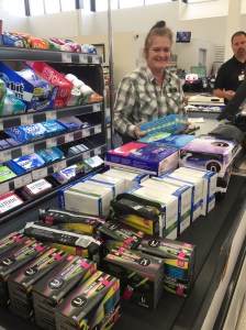 This photo shows Carolyn Law, Hy-Vee’s health care area manager, checking us out as we maximize our dollars — this is what $113 bought us: 428 tampons and 317 pads. Average cost = $0.15 per item.