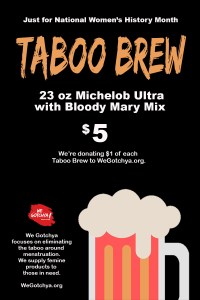 All month long, order a Taboo Brew for $5 and $1 will be donated to We Gotchya. Taboo Brew is a 23-ounce Michelob Ultra with Bloody Mary mix — mmm!!