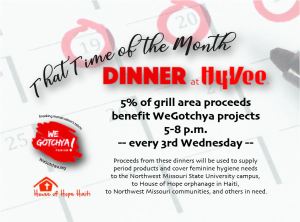HyVee Wednesday Night Dinners, 5-7 p.m. — Proceeds benefit We Gotchya.